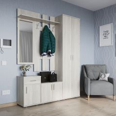 Представляет собой небольшую, компактную и функциональную прихожую. Она состоит из двух модулей – вешалки с крючками и тумбы-банкетки. Последняя включает в себя три полочки для различных вещей, ящика и мягкого сидения. Выпускается прихожая в двух цветах: корпус – ясень шимо светлый или ясень шимо темный, мягкий элемент – ткань и винилискожа серого цвета.